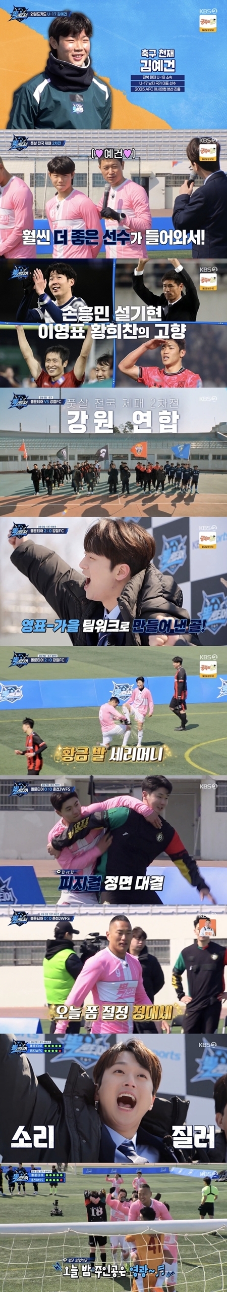 19일 방송된 KBS2 '뽈룬티어'에서는 '월드 클래스' 이영표, 설기현, 손흥민, 황희찬을 배출한 '축구의 땅' 강원 연합과의 풋살 전국 제패 2차전이 펼쳐졌다. '뽈룬티어'는 지난 경상 연합과의 1차전에서 승리한 기세를 몰아, 강원 연합을 상대로도 '무실점 2연승'을 올리며 기부금 1천만 원의 가능성을 높였다.