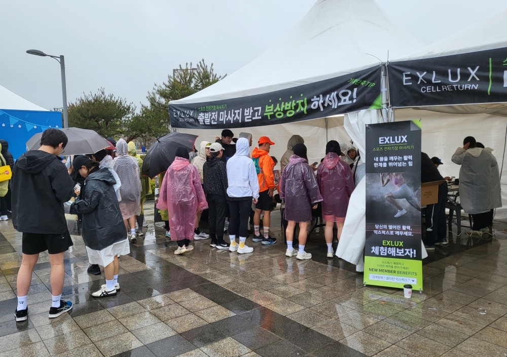 이날 운영된 익스럭스 체험 부스는 마라톤 참가자들의 피로 회복과 부상 예방을 목적으로 ‘펄스 전자기장(PEMF, Pulsed Electromagnetic Field)’ 마사지 체험 공간으로 운영됐고, 참가자들이 경기 전후 자유롭게 체험할 수 있도록 총 10대의 익스럭스 기기를 배치했다. 비가 내리는 궂은 날씨임에도 800명 이상의 참가자들이 PEMF 마사지를 체험하기 위해 위해 부스 앞에서 긴 대기줄을 형성하는 등 높은 관심을 보였다.