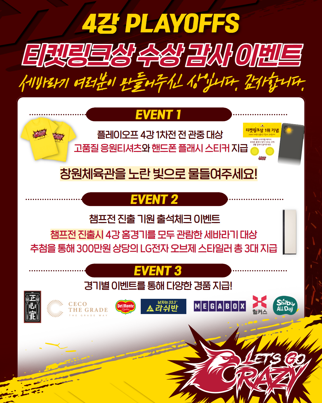 그리고, 챔프전 진출 기원 출석체크 이벤트도 진행한다. 챔프전 진출 기원 출석체크 이벤트는 챔프전 진출시 4강 홈경기를 모두 관람한 세바라기를 대상으로 추첨을 통해 300만원 상당의 LG전자 오브제 스타일러를 총 3대 지급한다.