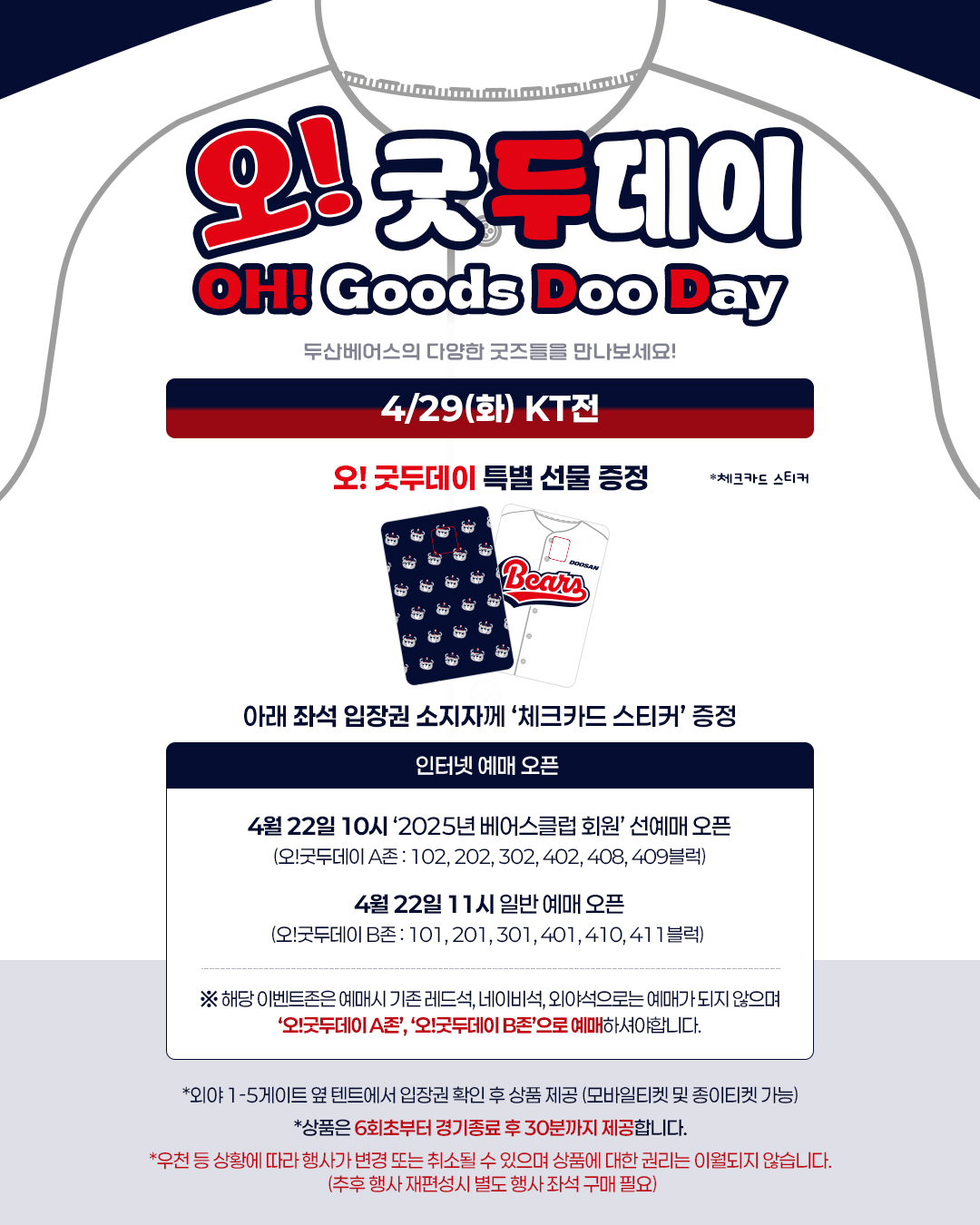 2025 베어스클럽 회원은 22일 오전 10시부터 오!굿두데이 A존(102, 202, 302, 402, 408, 409블록) 예매가 가능하며, 오전 11시부터 일반 예매자들도 오!굿두데이B존(101, 201, 301, 401, 410, 411블록)을 예매할 수 있다. 예매 시 해당 이벤트석은 기존 레드석, 네이비석, 외야석이 아닌 오!굿두데이 A존과 오!굿두데이 B존으로만 예매가 가능하다.