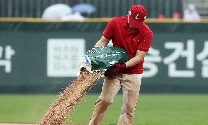 우려가 현실이 됐다. 오후 2시2분, 경기 시작 2분 만에 경기가 중단됐다. 빗줄기가 갑자기 굵어진 탓이다. 16분 후 재개됐지만 좀처럼 비는 그치지 않았다. 4회 초, 다시 비가 거세졌다. 오후 3시21분. 두 번째 우천 중단이 선언됐다. 이번엔 쉬이 줄어들 기미가 보이지 않았다. 비의 양은 오후 5시 무렵이 돼서야 줄어들었다. 이미 그라운드엔 물이 고인 상태였다. 그라운드 키퍼들과 구단 스태프들이 모두 나서 작업에 나섰다. 오후 5시40분, 드디어 경기가 재개됐다.