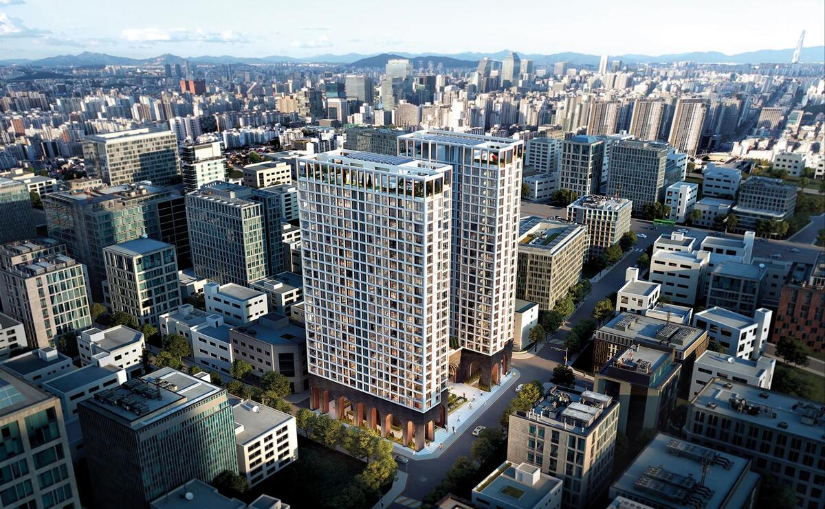 단지는 보행자와 주변 환경을 고려한 두 개의 타워로 나눈 설계가 특징이다. 1층은 8m 높이의 아치형 필로티 설계로 아치 아래 공간에 정원을 마련해 쾌적한 거리 환경을 제공한다.