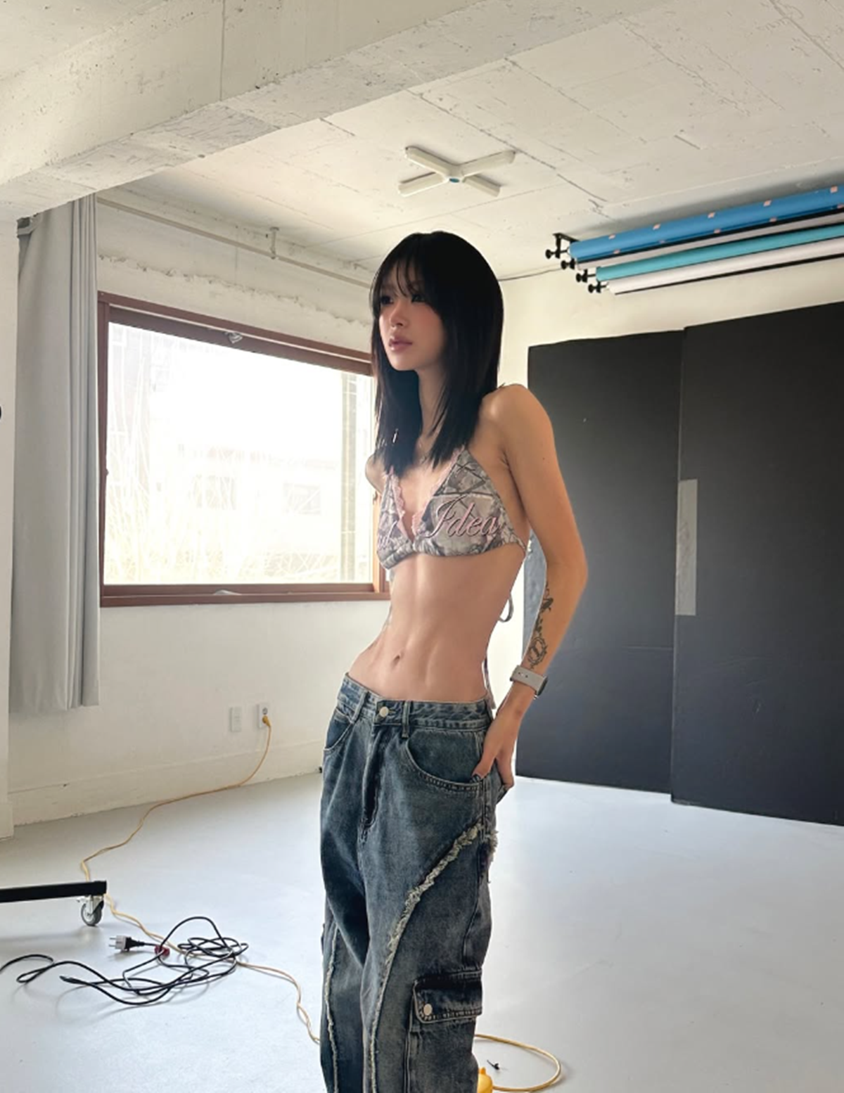 공개된 사진 속 최준희는 촬영 중으로 브라톱과 청바지만 입은 채로 포즈를 취하고 있다. 특히 최준희는 갈비뼈가 보일 정도로 마른 몸으로 시선을 사로잡는다. 앞서 최준희가 96kg에서 44kg으로 감량했다고 알린 바 있어 그가 열혈 감량을 한 것을 알 수 있다.