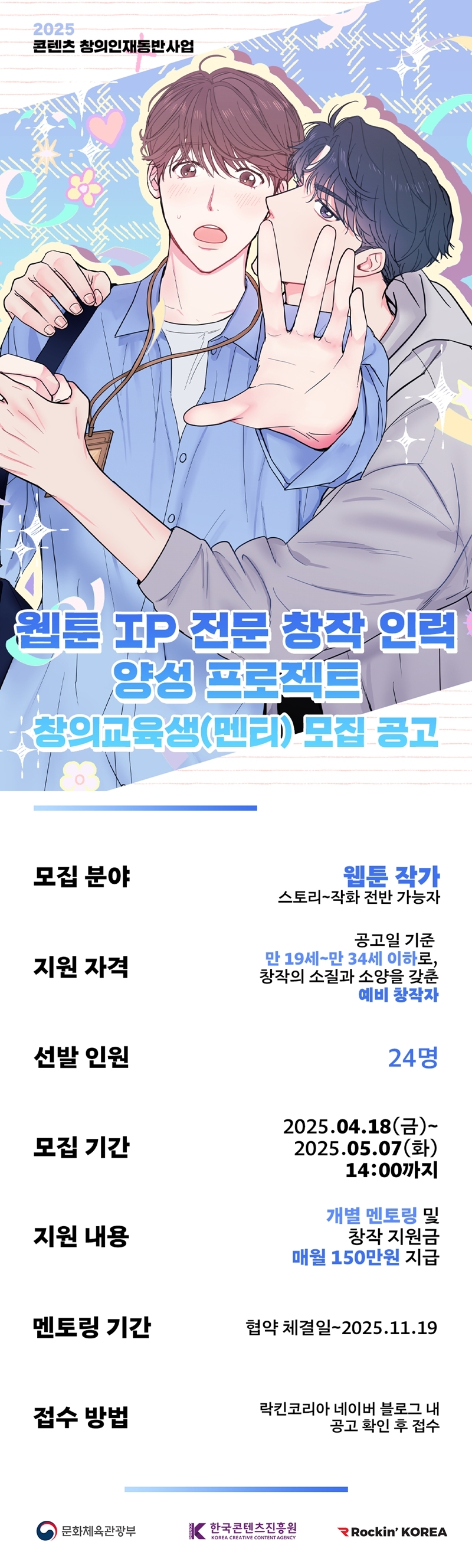 ‘웹툰IP 전문 창작인력 양성 프로젝트’는 미래 콘텐츠산업을 이끌어갈 젊은 창의인재 양성을 위해 창작 분야의 전문가와 교육생 사이의 도제식 멘토링을 통한 청년 인재의 창작 능력 개발을 목적으로 대한민국 대표 웹툰 작가, 웹툰 산업 관계자 및 기획자들이 멘토로 참여하며 1차 서류심사, 2차 대면심사를 거쳐 총 24명의 교육생(멘티)를 선발해 5월 20일부터 11월 19일까지 멘토링을 진행하게 된다.