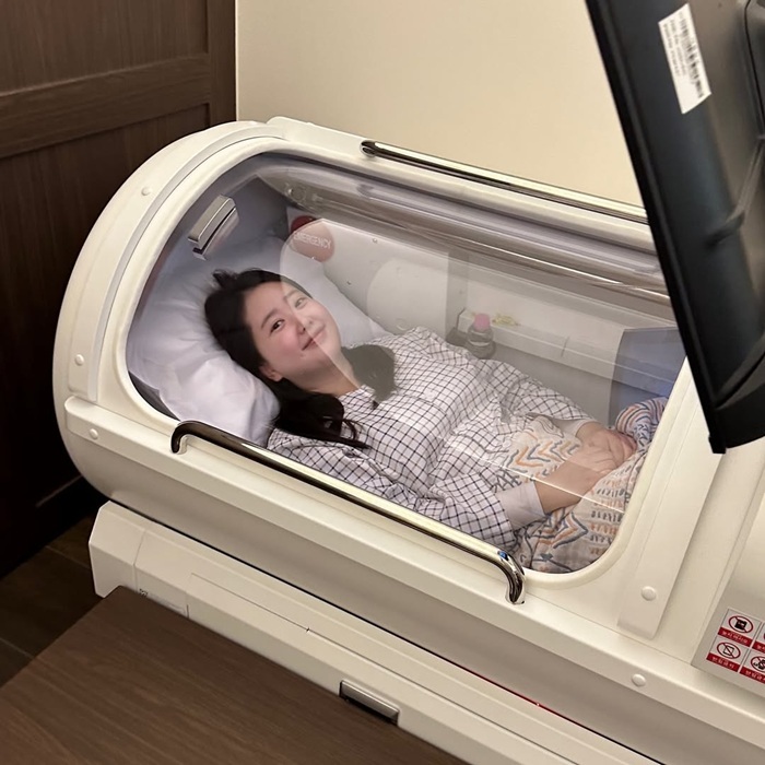 공개된 사진 속 김다예는 산소 체임버 안에서 안정된 표정으로 누워 있는 모습이다. 박수홍은 “고압산소 케어는 스트레스 완화와 수면의 질 개선은 물론 노화 방지에도 좋다고 해서 체력 회복이 필요한 아내, 저속 노화가 필요한 나를 위해 함께 받는 중이다”라며 긍정적인 감상평과 만족감을 드러냈다.