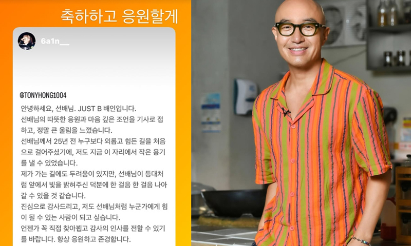 공개된 사진에는 배인이 홍석천에게 보낸 메시지가 담겨있다. 메시지에는 “안녕하세요 선배님. 저스트비 배인입니다. 선배님의 따뜻한 응원과 마음 깊은 조언을 기사로 접하고 정말 큰 울림을 느꼈습니다. 선배님께서 25년 전 누구보다 외롭고 힘든 길을 처음으로 걸어주셨기에 저도 지금 이 자리에서 작은 용기를 낼 수 있었습니다"라고 적혀있다.