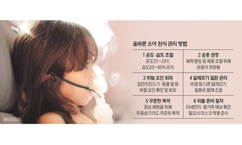 “소아 천식 치료의 첫 번째는 환경 관리다. 증상을 악화하는 환경이나 물질을 회피하면서, 증상이 조절되지 않을 시 약물을 사용하는 게 치료의 기본이다. 이를 위해선 원인 알레르기 물질을 알아둘 필요가 있다. 집먼지 진드기 알레르기로 인한 경우 먼지가 많이 쌓이는 카펫은 치우고, 공기청정기와 특수 이불 커버를 사용하는 게 권고된다. 단, 지나치게 고가의 제품을 구매하는 것은 불필요하다. 꽃가루 및 미세먼지에 대처하려면 실외 활동을 최소화하고, 마스크 등 보호장구를 착용해야 한다. 외출 전에는 실시간 화분지수 및 미세먼지 예보를 확인하고, 외출 후 돌아와서는 옷을 갈아입고 잘 씻는 게 중요하다. 실내 온습도 관리도 필요하다. 차고 건조한 공기는 천식의 주요 악화 인자다. 온도 22~24도, 습도 50~60% 정도로 약간 습하고 따뜻한 환경을 조성하자. 호흡을 가쁘게 하는 활동을 피하는 것이 좋다. 다만, 따뜻한 환경에서는 집먼지진드기가 잘 성장하므로 적절한 온습도를 유지해야 한다.”