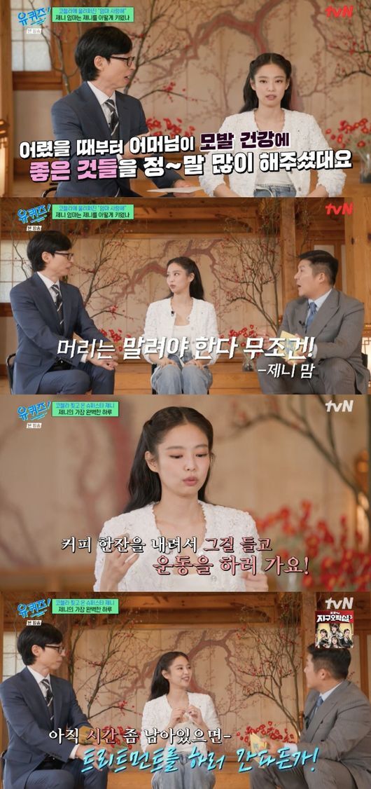 이날 제니는 어려서부터 피부 관리, 모발 관리에 신경을 썼다고 밝혔다. 그는 “엄마가 어릴 때부터 관리하는 방법을 알려주셨다. 지금 너무 감사드린다”라고 말했다.