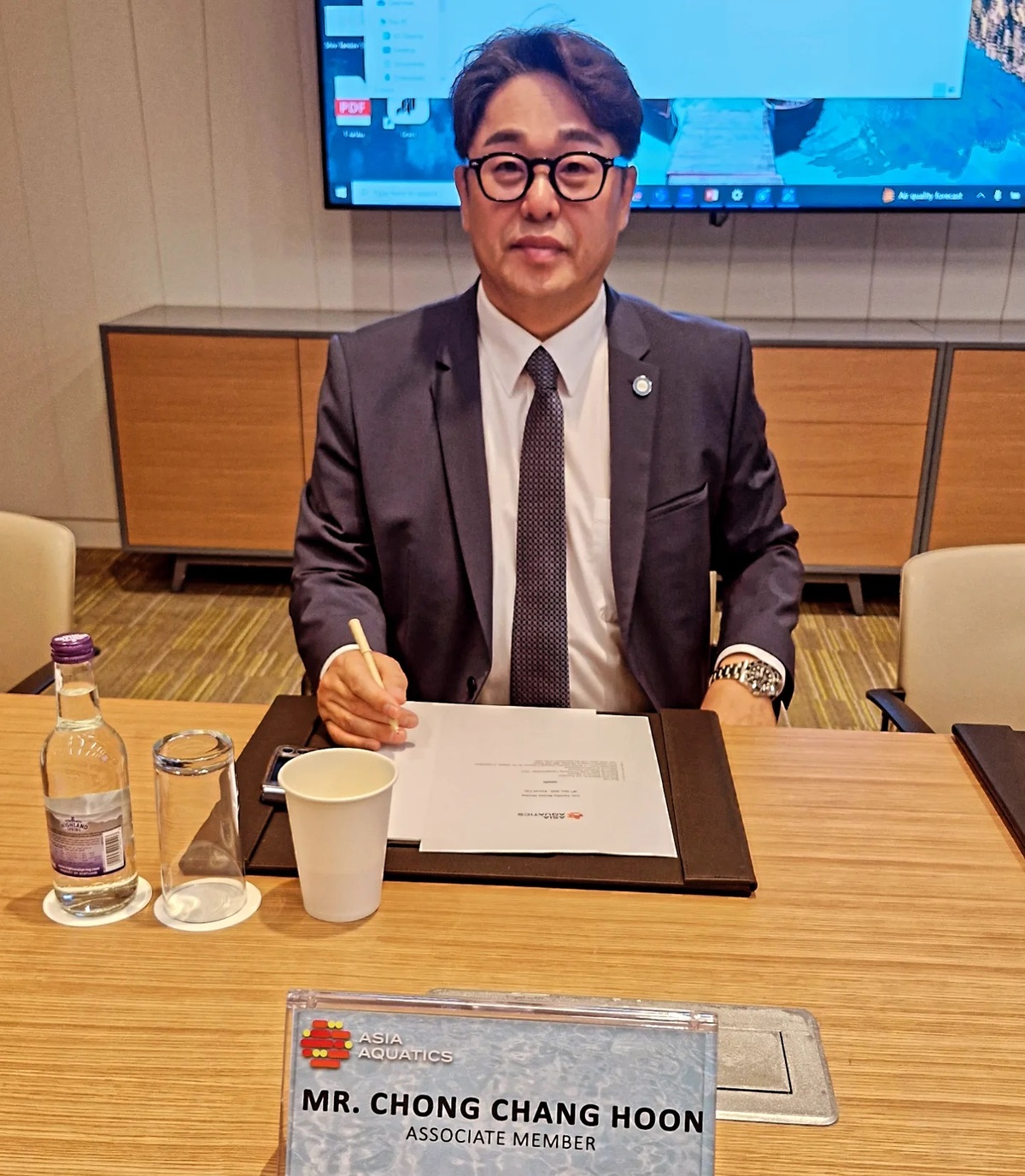 정 회장은 작년 4월, 태국에서 열린 아시아수영연맹 정기총회에서 쿠웨이트 출신 세이크 카리드 비 알 사바의 지명을 받아 집행위원으로 임명된 바 있다. 이날은 첫 집행위원회 참석이었다.