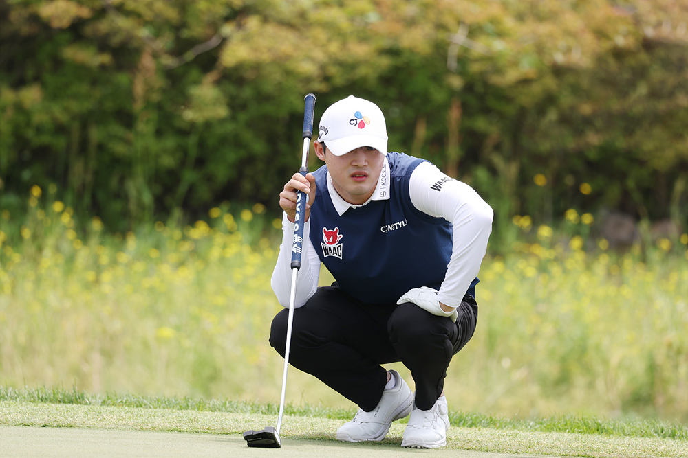 1번홀에서 파를 기록한 배용준은 2번홀(파4)에서 버디를 기록하며 공동 선두로 올라섰다. 하이라이트는 3번홀(파3)이었다. 아이언 티샷이 살짝 빗나가면서 볼을 그린에 올리지 못했다. 하지만 위기를 기회로 만들었다. 짜릿한 칩인 버디를 잡아내며 2점을 추가해 단독 선두로 올라섰다. 기세를 올린 배용준은 4, 5번홀(이상 파4)에서도 ‘버디쇼’를 펼치며 독주를 시작했다.