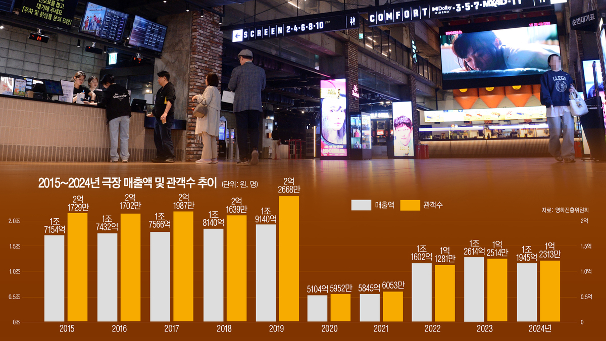 최근 영화진흥위원회가 발표한 2024년 한국 영화산업 결산 보고서에 따르면 코로나19 팬데믹 이전인 2017~2019년 전체 매출액 평균(1조8282억원)과 비교해 지난해 전체 매출액은 65.3%(1조1945억원) 수준이다. 2023년과 대비해서도 5.3% 하락한 수치다. 엔데믹 이후 관객이 극장을 다시 찾을 것이라는 기대감이 있었지만 최근 3년간 극장 매출액은 1조2000억원 내외의 박스권을 벗어나지 못하는 형국이다.