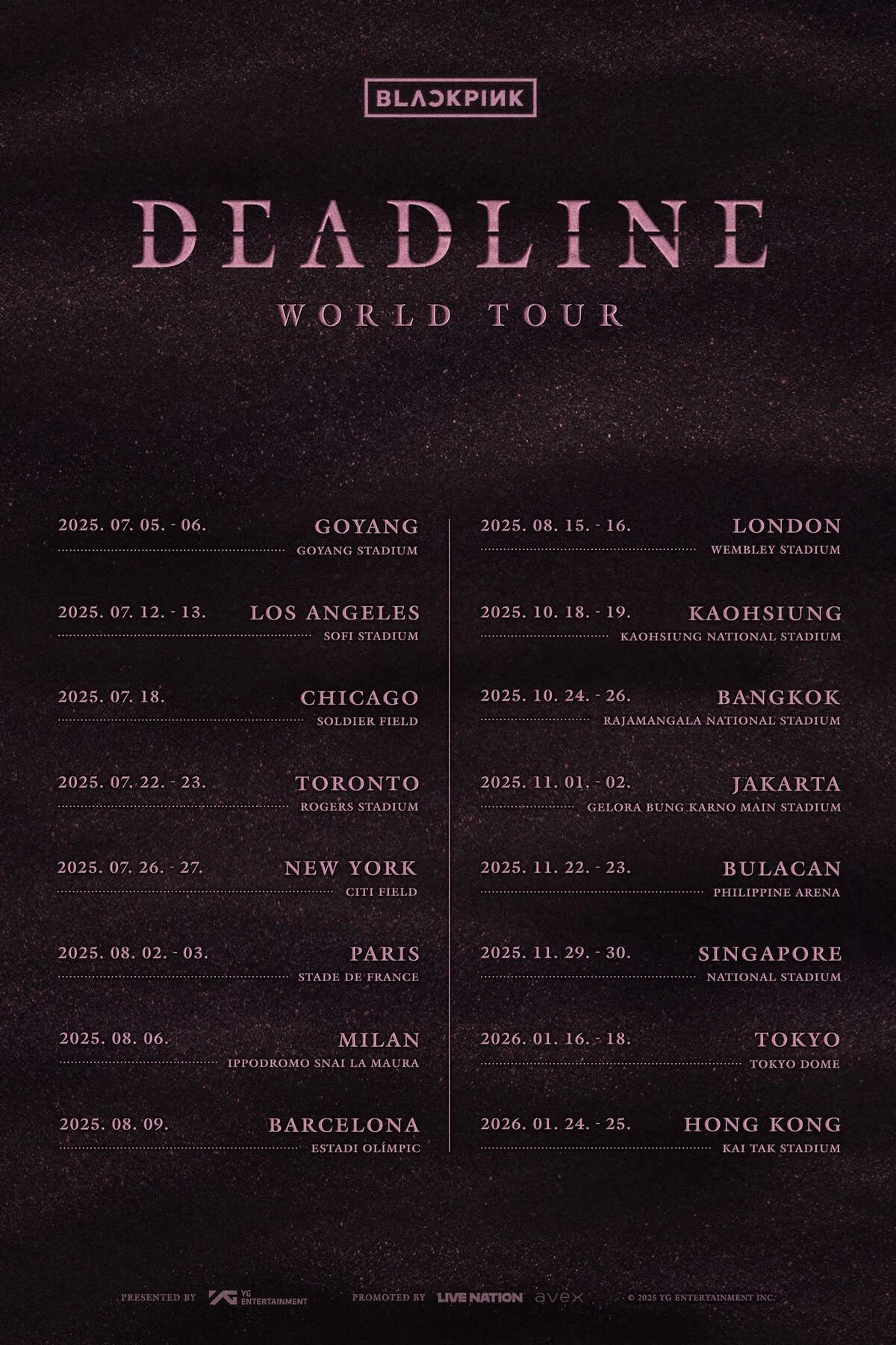 27일 YG엔터테인먼트에 따르면 블랙핑크는 'BLACKPINK WORLD TOUR <DEADLINE>'의 10월 18·19일 가오슝, 10월 24·25·26일 방콕, 11월 1·2일 자카르타, 11월 22·23일 불라칸, 11월 29·30일 싱가포르, 1월 24·25일 홍콩 공연을 추가로 개최한다.