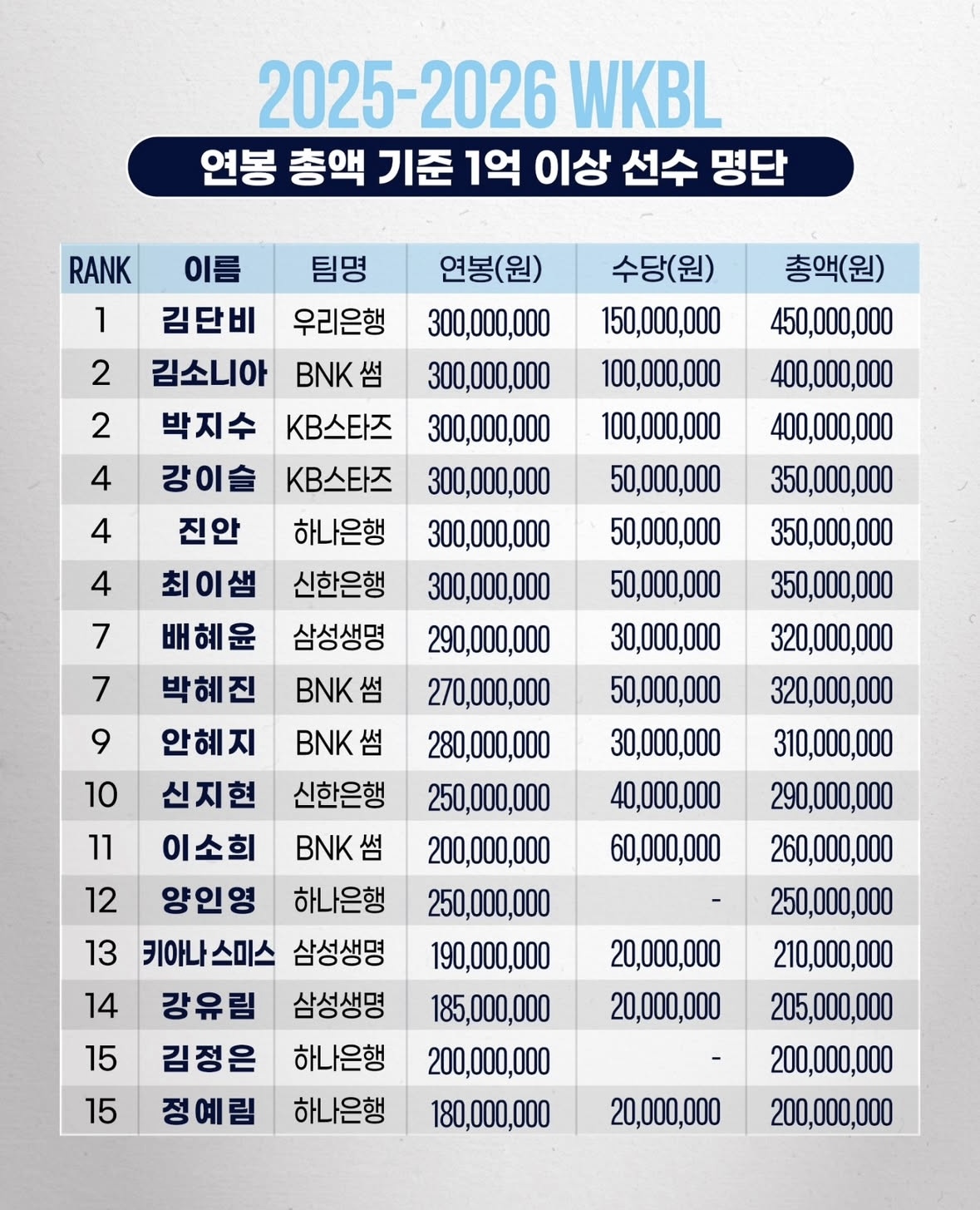 81명의 선수 중 우리은행 김단비는 2022∼2023시즌부터 2025-=∼2026시즌까지 연봉 총액 1위 기록을 4년 연속 이어갔다. 김단비는 연봉 총액 4억 5000만원(연봉 3억원, 수당 1억5000만원)으로 공동 2위 BNK 썸 김소니아, KB스타즈 박지수의 4억원(연봉 3억원, 수당 1억원)보다 5000만 원 높은 연봉 총액을 기록했다.
