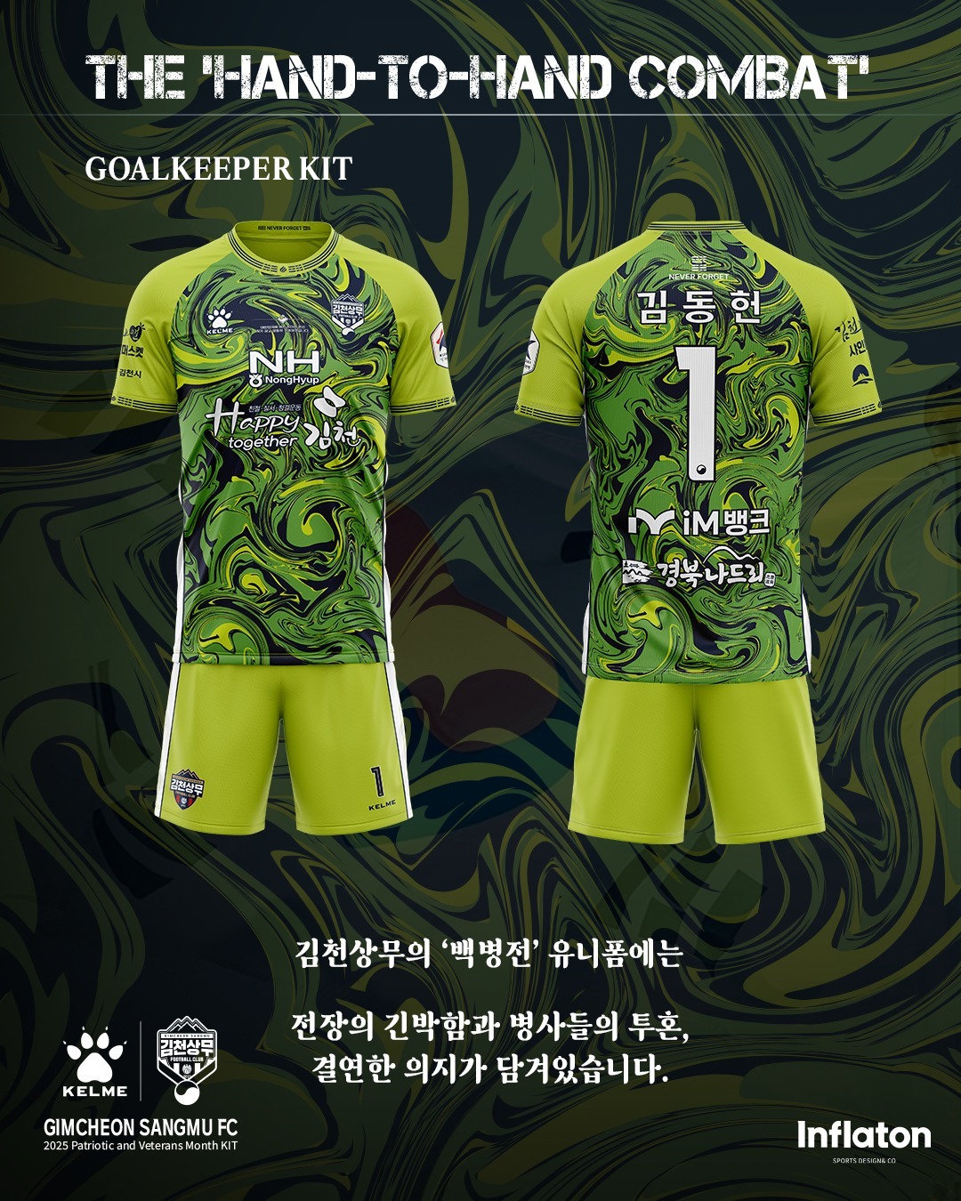 프로축구 K리그1 김천상무프로축구단이 6월 호국보훈의 달을 기념하는 호국보훈 유니폼을 공개했다. 이번 호국보훈 유니폼은 ‘백병전(HAND TO HAND COMBAT)’에서 영감을 받아 전장의 긴박함과 병사들의 투혼과 결연한 의지를 나타내었다.