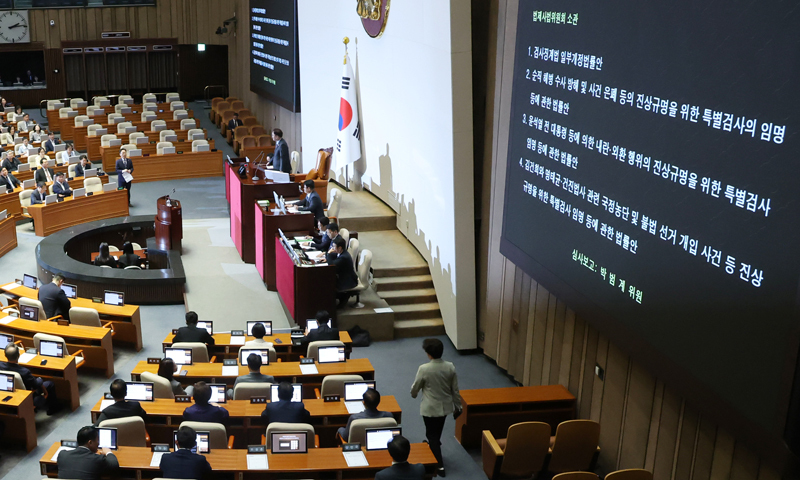 윤석열 전 대통령과 부인 김건희 여사, 정부 고위층을 겨냥한 중대 수사 법안들이 본회의 문턱을 넘어서면서 정국은 다시 특검 정국으로 급물살을 탈 전망이다. 이들 특검법안은 이날 국회에서 모두 찬성 194표, 반대 3표, 기권 1표로 가결됐다.