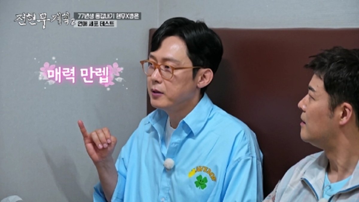 먹방 도중 결혼 이야기가 나오자 곽튜브는 “두 분 다 연애세포가 식은 것 같다”고 긴급 진단한 뒤, ‘연애 손꼽기 게임’을 제안했다. 그러자 전현무와 박병은은 “연애세포 살아 있는데, 왜?”라며 동시에 발끈해 ‘대환장 케미’를 발산했다. 그럼에도 게임을 시작한 곽튜브는 “솔로가 된 지 2년이 넘었다”는 질문을 던졌고, 두 사람 모두 손을 꼽으며 인정했다. 뒤이어 ‘요즘 거울을 보면 내가 매력 없게 느껴진다’는 질문에 전현무는 “매력은 쩔어~”라며 자신 있게 외쳤고, 박병은 역시 “매력은 만렙!”이라며 굳이 MZ 언어를 사용해 엉뚱미를 발산했다.