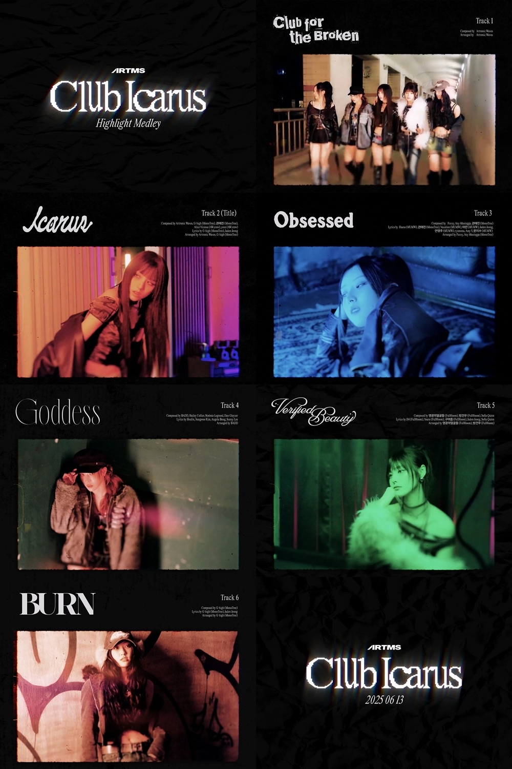 하이라이트 메들리 영상에는 타이틀곡 'Icarus'를 비롯해 'Club for the Broken', 'Obsessed', 'Goddess', 'Verified Beauty', 'BURN'까지 총 여섯 트랙의 매력을 미리 만나볼 수 있는 것은 물론, 아르테미스 멤버들의 빛나는 비주얼까지 담겨 눈과 귀를 사로잡았다.