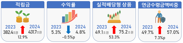 금융감독원과 고용노동부가 9일 발표한 2024년 우리나라 퇴직연금 투자 백서에 따르면 지난해 퇴직연금 적립금은 431조7000억원으로 전년대비 49조3000억원(12.9%) 증가했다.