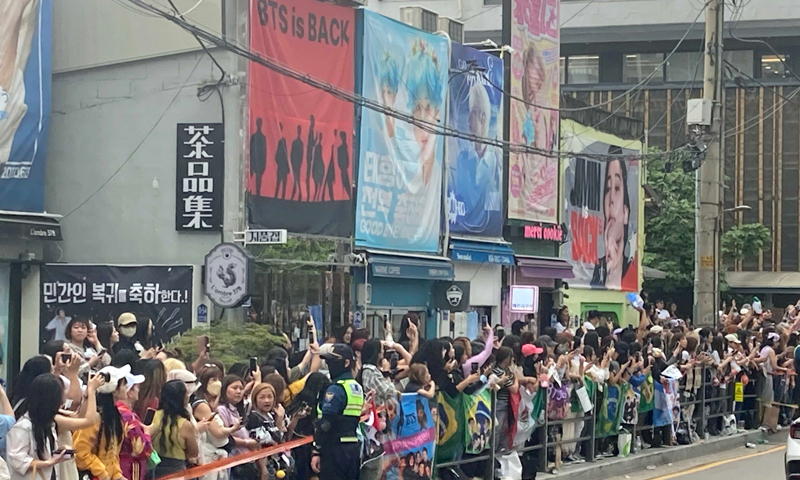 사옥 앞 도로에는 멤버들의 전역을 축하하는 문구와 사진이 담긴 전광판을 실은 트럭이 가득했다. 인근 카페 등도 멤버들의 얼굴이 담긴 현수막으로 건물 외벽을 장식했다. 거리에는 전광판에서 흘러나오는 방탄소년단의 노래가 울려퍼졌고 팬들은 전광판과 현수막을 배경으로 인증사진을 찍었다. 방탄소년단 상징색인 보라색으로 옷을 맞춰입은 팬들이 일대를 가득 메우면서 거리 또한 보랏빛으로 가득 찼다.