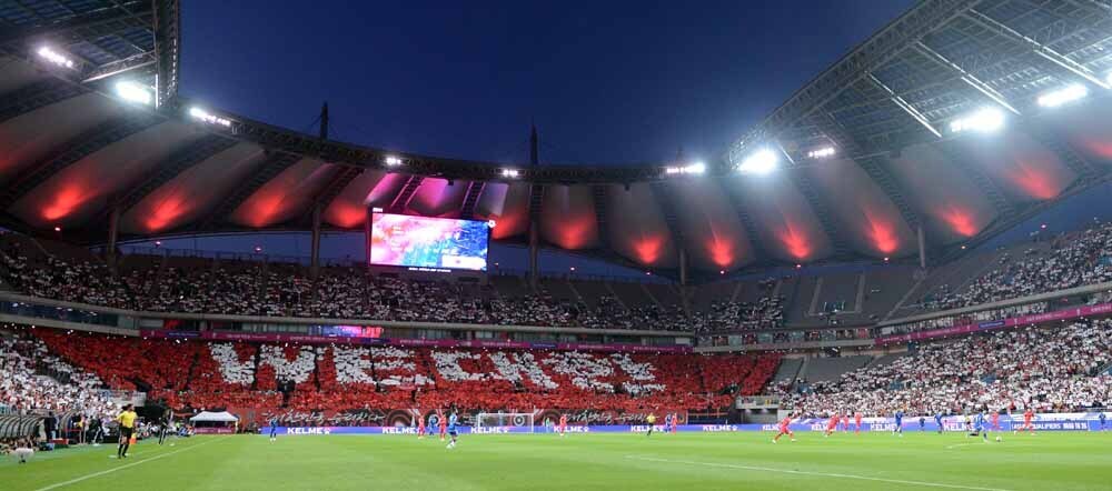카드 섹션도 펼쳐졌다. 붉은 악마는 월드컵 본선 진출을 기념해 ‘WE 대한’이라는 문구의 카드섹션을 준비했다. 경기 시작 10여분이 지난 시점에서 붉은 악마와 관중들은 카드를 높게 들었다.