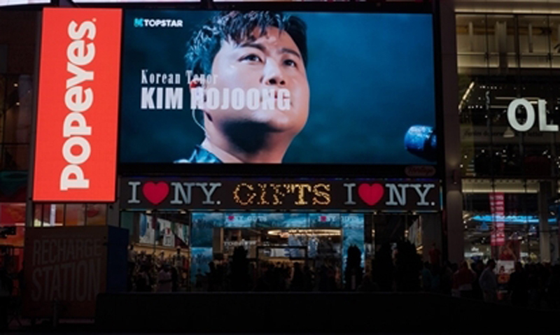 가수 김호중이 뉴욕 타임스퀘어 전광판에 등장했다. 글로벌 K-POP 팬덤 플랫폼 ‘K탑스타’가 주최한 ‘대한민국 트롯대전’에서 압도적인 득표수로 최종 1위를 차지한 결과다.