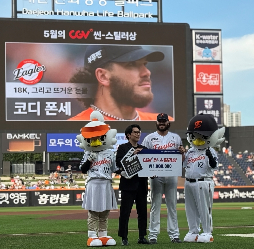 CGV는 KBO(한국야구위원회)와 함께 올해 새롭게 신설한 CGV 공식 스폰서상 ‘월간 CGV 씬-스틸러상’의 5월 수상자로 한화 이글스 폰세 선수를 선정하고 시상을 진행했다고 12일 밝혔다.