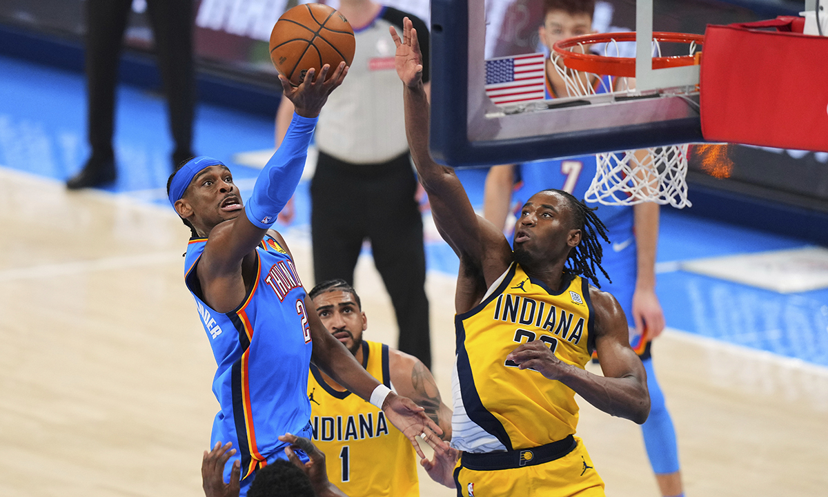 미국프로농구(NBA) 오클라호마시티 선더가 14일(한국 시간) 미국 인디애나주 인디애나폴리스의 게인브리지 필드하우스에서 열린 2024∼2025 NBA 챔피언결정전(7전4선승제) 4차전 인디애나 페이서스와의 원정경기를 111-104로 이겼다. 이로써 양 팀의 시리즈 승부는 2승2패 동률이다.