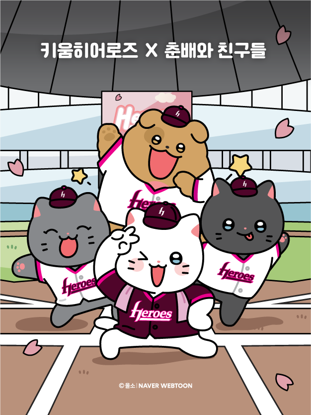 이번 협업은 ‘춘배’의 유쾌한 매력을 야구와 결합해 새로운 즐거움을 선사하고자 기획됐다. 특히 키움 유니폼을 입고 응원 도구를 든 춘배와 친구들의 모습을 담아낸 일러스트로 다양한 협업 상품을 선보인다.