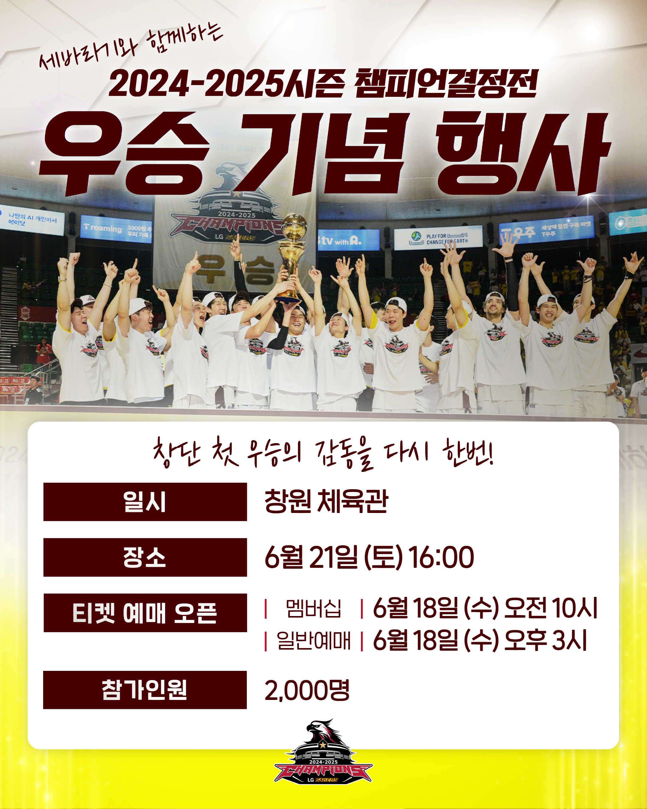 남자프로농구 LG는 21일 잠실학생체육관 원정경기에서 맞이한 구단 역대 최초 챔피언결정전 우승의 기쁨을 더 많은 창원 팬들과 나누기위해 홈 경기장인 창원체육관에서 우승 기념 행사를 진행한다.