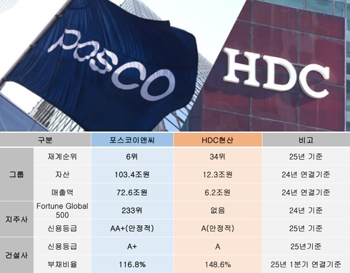 이 외에도 50층 이상 초고층 건축 실적, 토건 기술자 보유 수, R&D 투자 등 각종 정량 지표에서 포스코이앤씨는 HDC현산을 압도한다. 그룹의 체급 차이 또한 분명하다. 포스코그룹은 국내 재계 6위로, HDC그룹(34위)과는 자산·매출·국제 신뢰도 측면에서 상당한 격차를 보이고 있으며, 글로벌 평가기관에서도 포스코그룹은 Fortune 500에 이름을 올리고 있다는 것이 업체 측 설명이다..