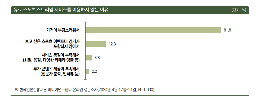 통계도 이를 방증한다. 한국언론진흥재단 미디어연구센터의 설문조사에 따르면, 유료 스포츠 플랫폼 이용 경험이 없는 응답자 중 81.8%가 ‘가격이 부담돼서’라고 답했다. 유료 스포츠 중계 시장에서 가격이 가장 높은 장벽으로 작용하고 있는 셈이다.