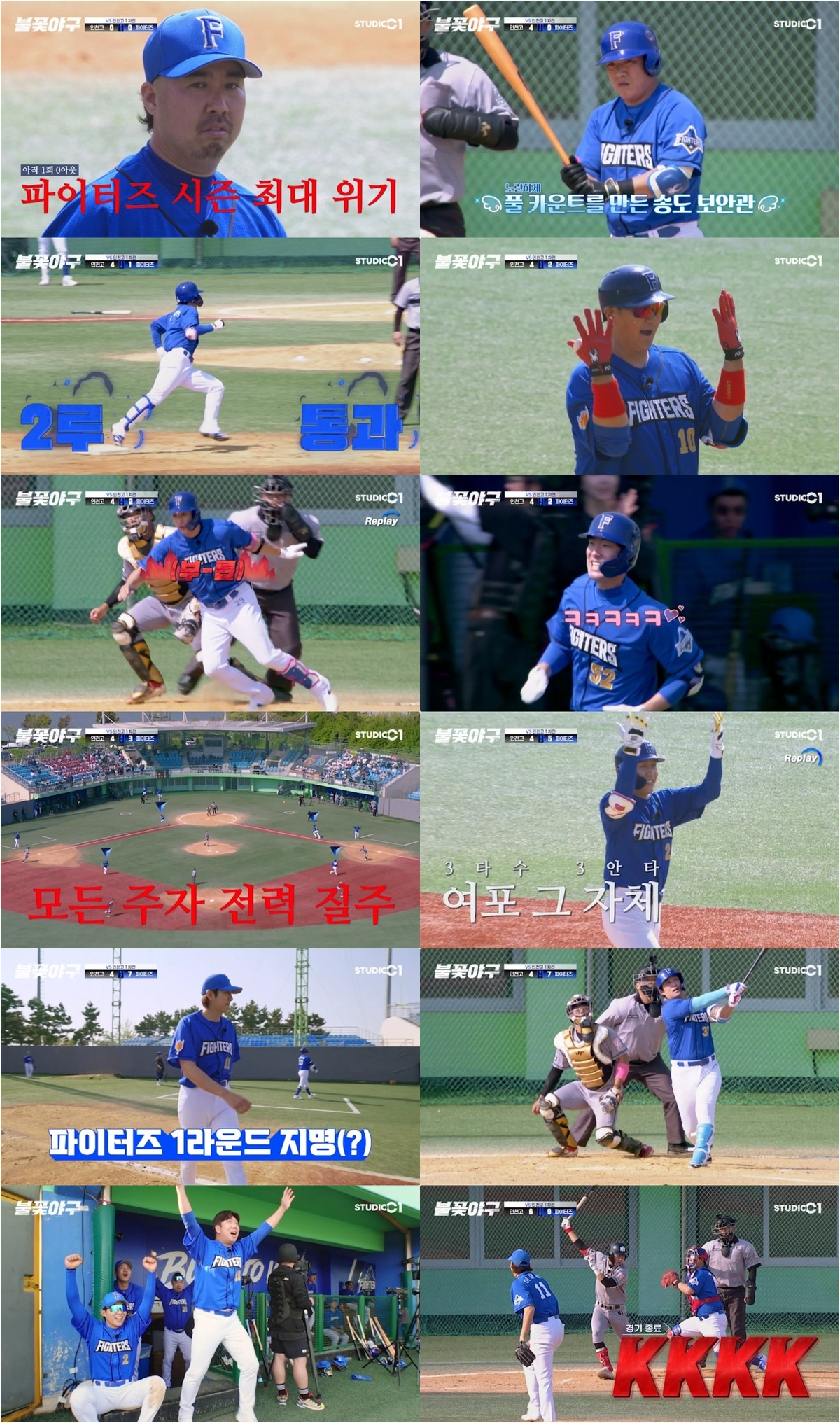어제(23일) 오후 8시 스튜디오C1 공식 유튜브 채널을 통해 공개된 야구 예능 프로그램 ‘불꽃야구’ 8화에서는 불꽃 파이터즈와 인천고의 숨 막히는 접전이 펼쳐졌다. 유희관이 1회부터 4실점을 내주며 흔들렸지만, 이후 마운드와 타선이 빠르게 안정감을 되찾으며 9:6 대역전극을 완성했다.