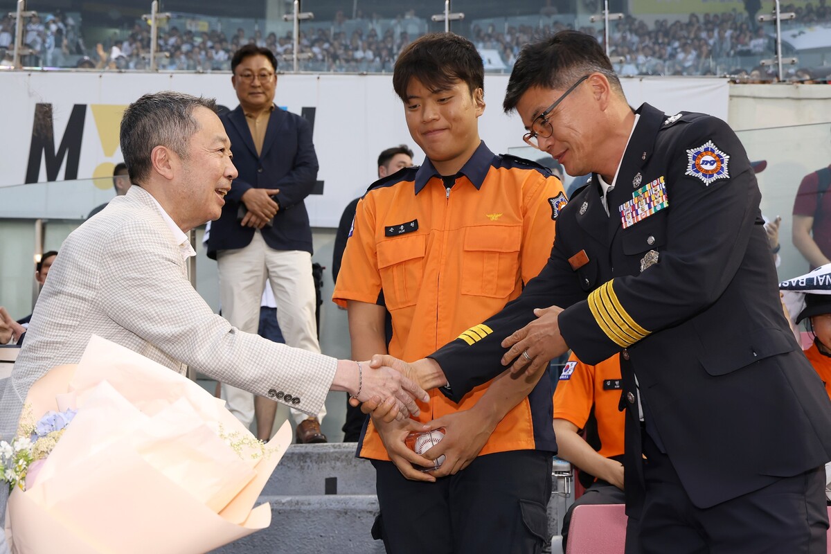 프로야구 두산과 SSG의 맞대결이 펼쳐진 24일 서울 잠실구장. 3회 초가 끝난 시점, 관중석에 낯익은 얼굴이 모습을 드러냈다. 박정원 두산그룹 회장(두산베어스 구단주)다. 이날 시구를 맡은 경북 119 산불대응단 소속인 손용원 소방교와 그의 부친 손진복 소방경에게로 향했다. 직접 꽃다발을 건네며 나라를 위해 기꺼이 헌신한 부분에 대해 감사함을 표현했다.