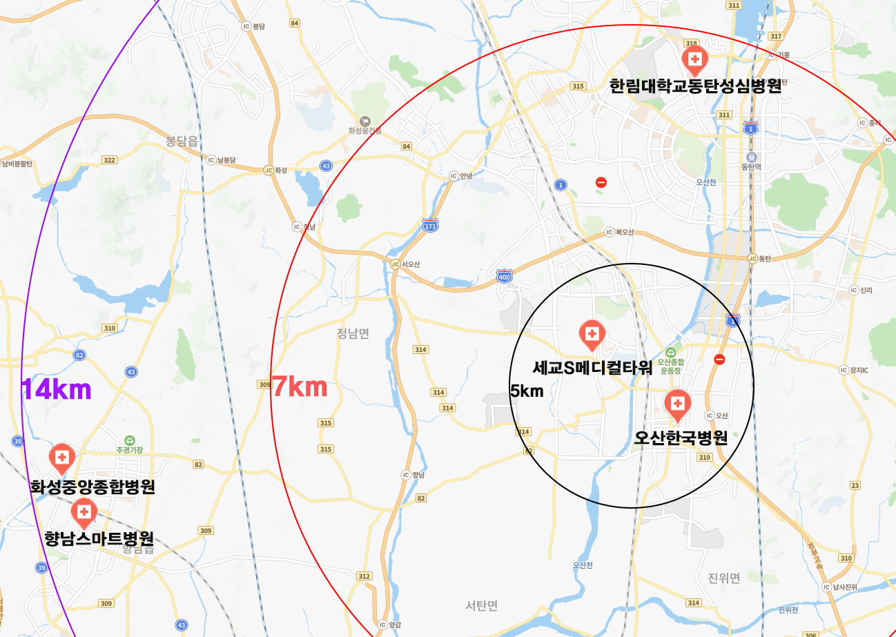 지역 거점 의료 인프라도 쉽게 접근 가능하다. 대표적으로 화성중앙종합병원(24시간 응급 수술 체계, 권역외상센터 협력(아주대, 분당서울대 등), 139병상), 향남스마트병원(특화, 99병상, 화성중앙병원과 연계), 한림대학교 동탄성심병원(지역 거점 대학병원, 진료과 다양, 고난도 진료 수행), 오산한국병원(종합병원, 응급진료 포함 다양한 진료과 운영, 지역 대표 병원)이 인근에 고루 분포돼 있다.