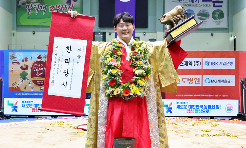오창록은 8일 충북 보은군 보은국민체육센터서 열린 대회 한라급 장사 결정전(5전 3선승제)에서 이효진(울주군청)을 3-1로 꺾고 우승을 차지했다. 지난 2023년 10월 안산대회 이후로 재차 꽃가마를 타는 기쁨을 누린 것. 그가 한라장사에 오른 건 이번이 통산 15번째다.