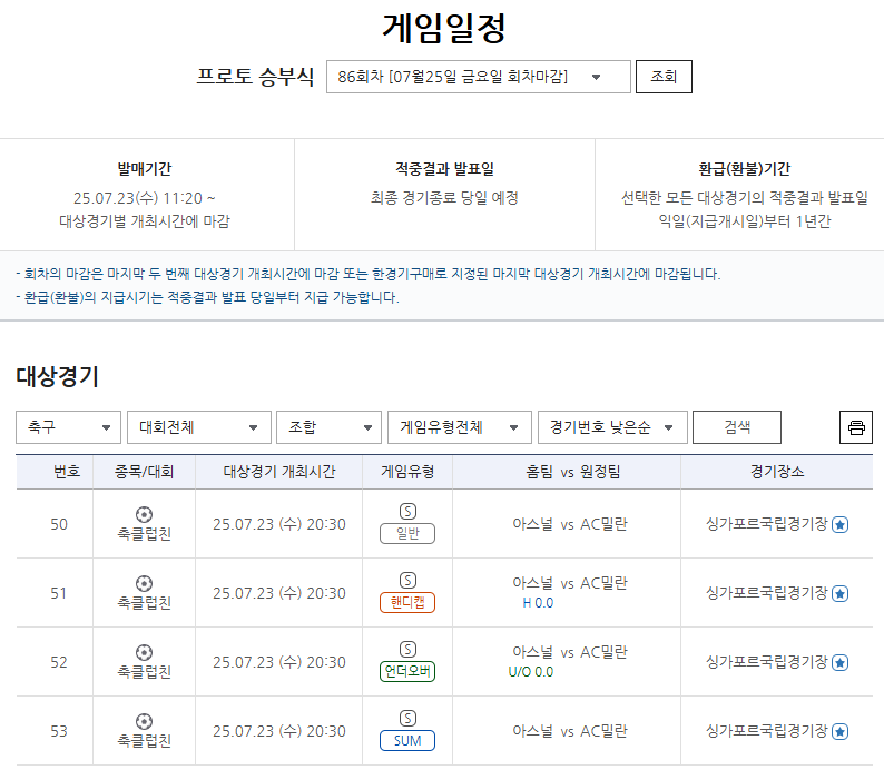 서울올림픽기념국민체육진흥공단이 발행하는 체육진흥투표권 스포츠토토의 수탁사업자 한국스포츠레저가 오는 23일 오후 8시30분 싱가포르 국립경기장에서 열리는 아스널(홈)-AC밀란(원정)전을 대상으로 한 프로토 승부식 86회차 게임을 발매한다고 이날 밝혔다.