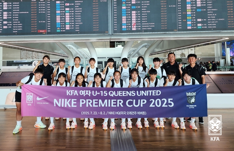 여자축구 15세 이하(U-15) 선발팀이 2년 연속 ‘2025 나이키 프리미어컵 국제유소년 축구대회’에 출전한다. U-15 선발팀은 지난 23일 인천공항을 통해 출국했다. 대회는 미국 오레건주 비버튼 나이키 본사에서 열린다.