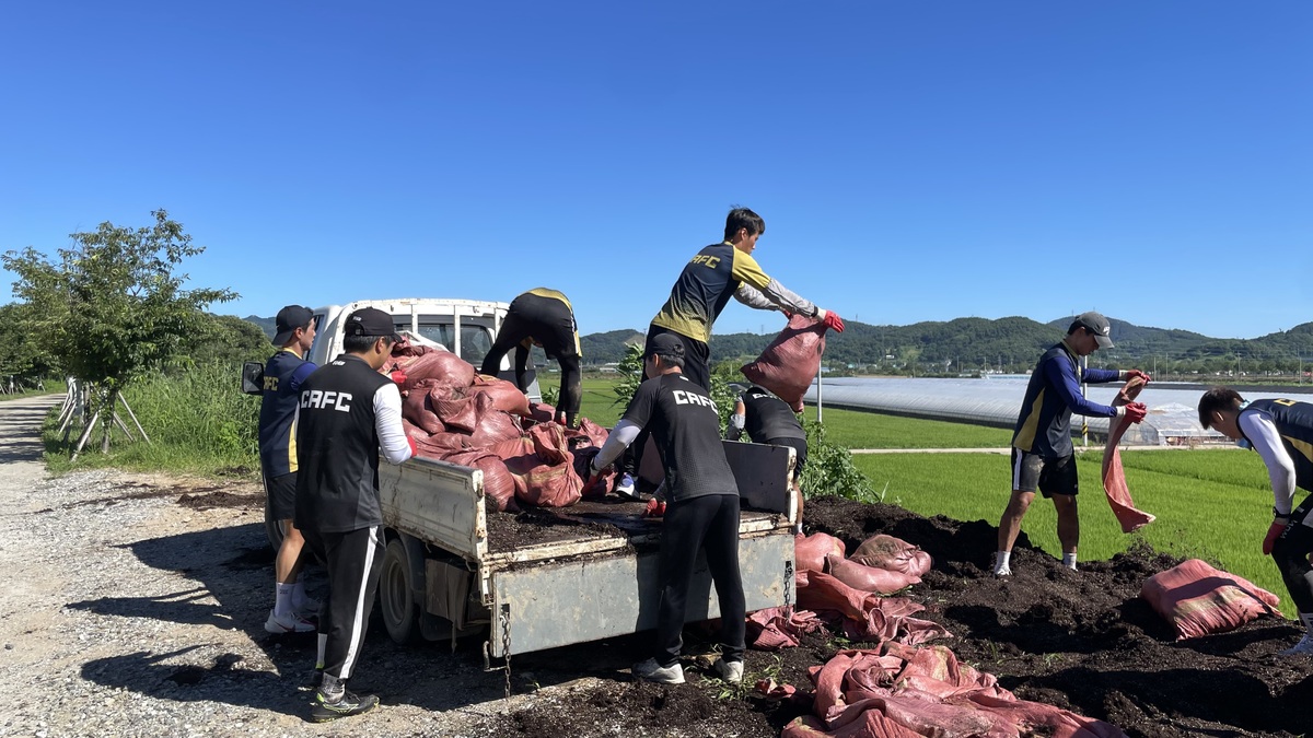 충남아산은 27일 선수단을 비롯한 50여 명의 구단 관계자들이 함께 아산시 염치읍 피해 농가를 찾아 수해 복구 자원봉사 활동에 나섰다.