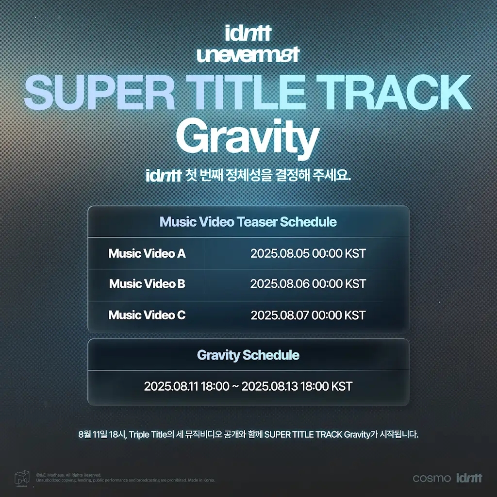 모드하우스는 30일 0시 아이덴티티(idntt)의 공식 SNS 채널에 첫 유닛 unevermet의 슈퍼 타이틀 트랙을 결정하는 그래비티(Gravity)를 공지, 글로벌 팬들에게 벅찬 설렘을 안겼다.