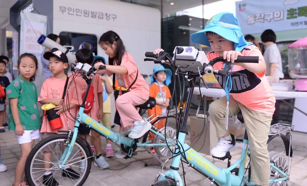서울 동작구 동작구청 신청사에서 열린 '친환경에너지 체험활동 행사'에서 참가 어린이가 친구들의 응원을 받으며 자전거로 팝콘 만들기 체험을 하고 있다.
