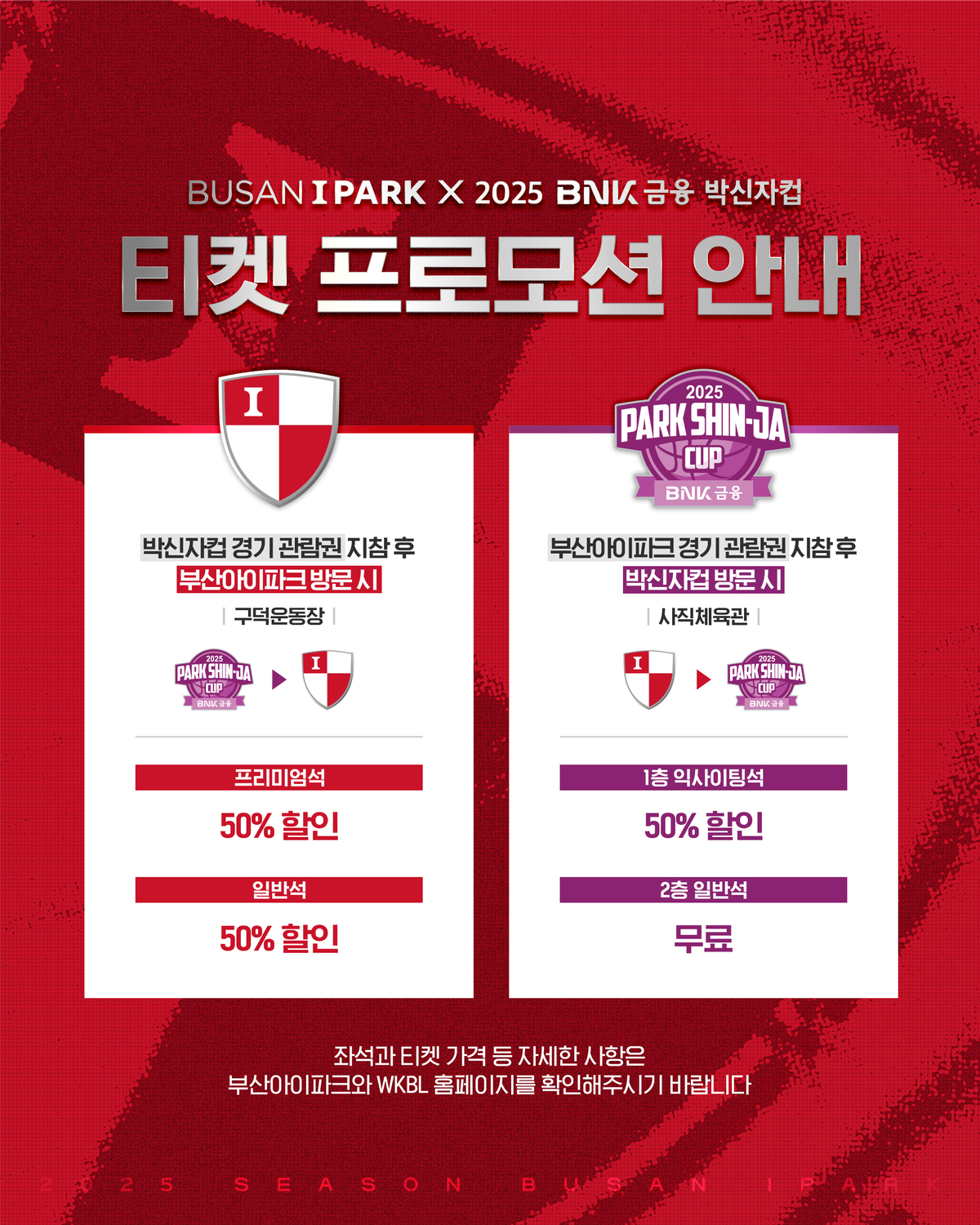 팬들은 이번 프로모션을 통해 합리적인 가격으로 부산 홈 경기와 박신자컵 경기를 현장에서 관람할 수 있다. 부산 홈경기 관람권을 박신자컵 매표소에 제시하면 1층 익사이팅석은 50% 할인 혜택을 받을 수 있다. 2층 일반석은 무료로 관람할 수 있다. 반대로 박신자컵 티켓을 구덕운동장 내 매표소에 제시하면 프리미엄석과 일반석 50% 할인 혜택을 받을 수 있다. 부산의 할인 대상 홈경기는 오는 9일 인천 유나이티드전, 30일 충북청주전, 다음달 6일 수원 삼성전, 다음달 21일 전남전으로 총 4경기다.