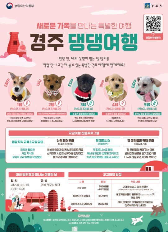 교감 여행을 희망하는 가족(가족당 최대 2명)은 8일부터 25일까지 참가 신청을 하면 된다. 최종 참가자는 심사를 거쳐 이달 27일 발표된다. 강아지와 경주 여행을 다녀온 뒤 입양 여부를 결정할 수 있다.