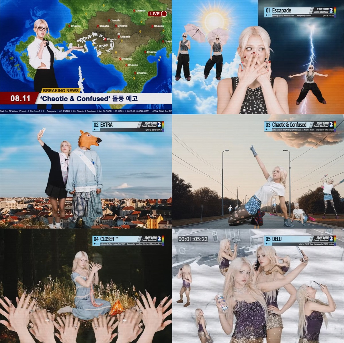 공개된 영상 속 전소미는 기상 캐스터로 깜짝 변신, 새 EP 'Chaotic & Confused'가 제목처럼 돌풍을 일으킬 것을 예고한다. 뒤이어 1번 트랙부터 5번 트랙까지, 각 곡의 무드에 어울리는 영상이 펼쳐지며 K팝 팬들의 이목을 집중시킨다.