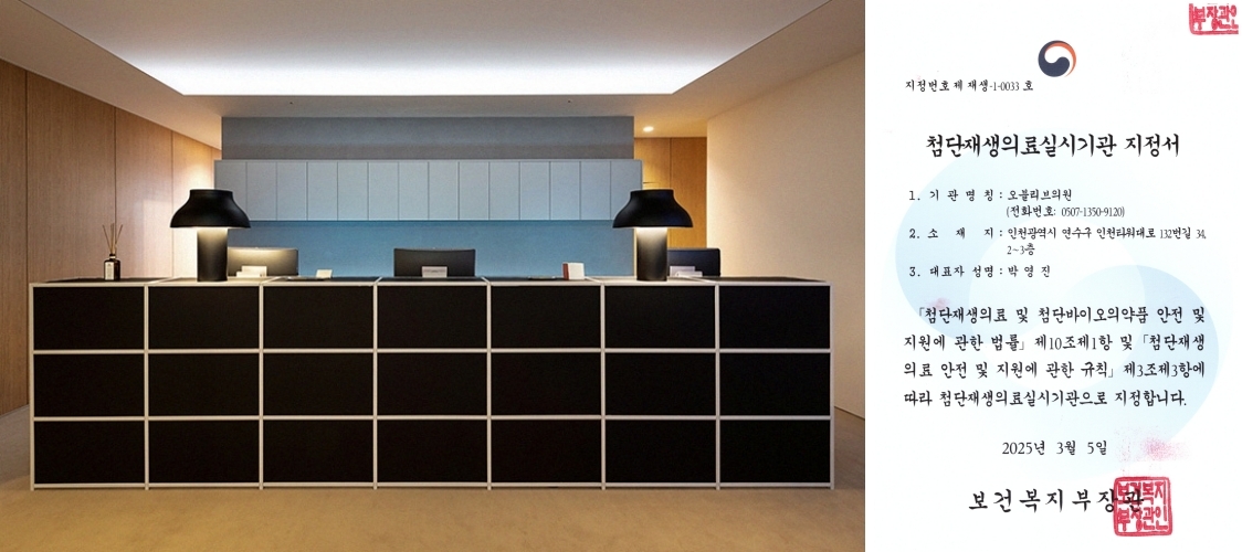인천 송도 오블리브의원(대표원장 박영진)이 보건복지부로부터 ‘첨단재생의료실시기관’으로 지정됐다고 밝혔다.