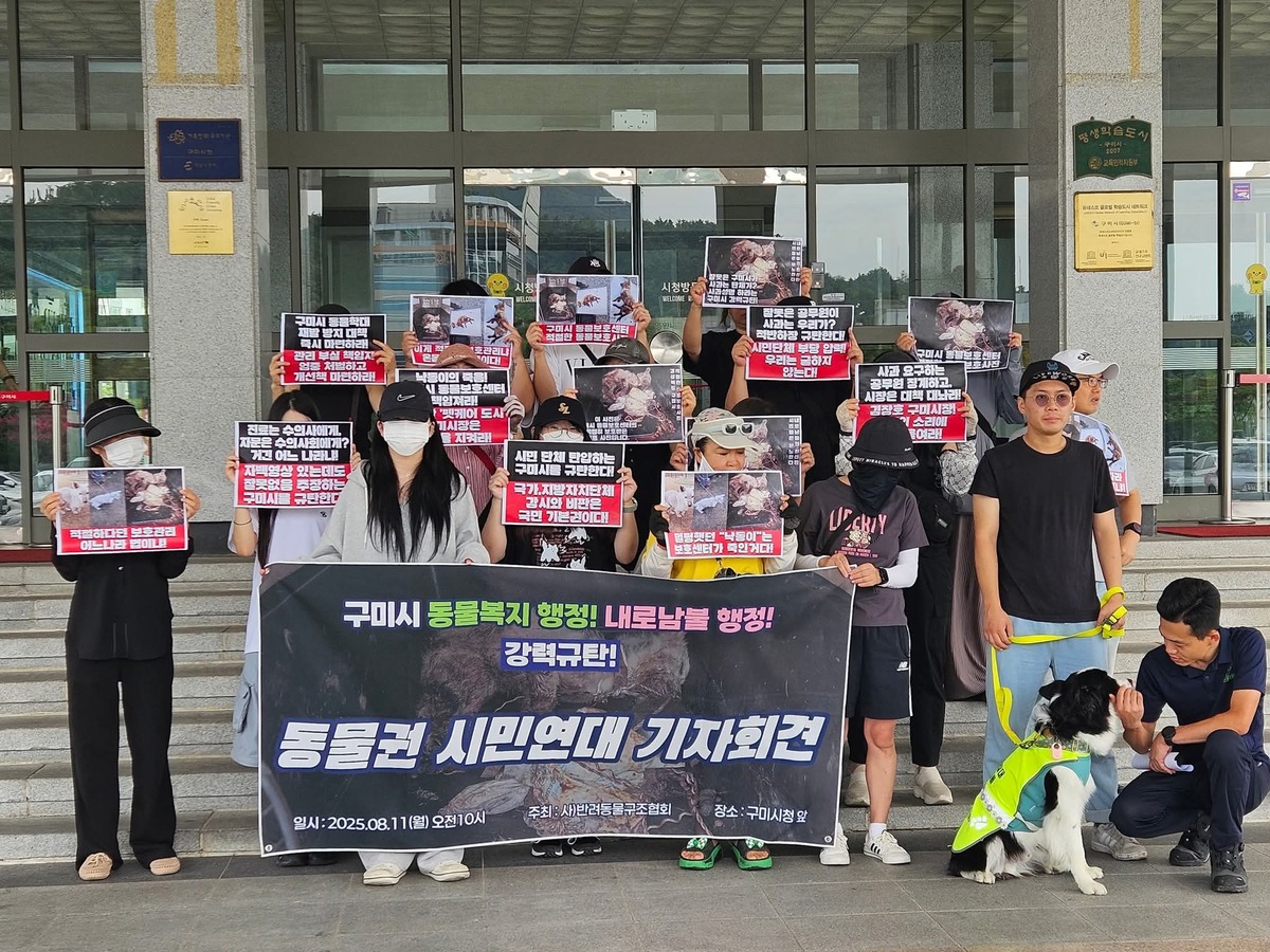 반려동물구조협회와 시민연대가 11일 구미시청 앞에서 구미시 동물보호센터(애니멀케어센터)의 동물 방치 및 학대 의혹 규명 및 책임자 처벌을 촉구하는 집회 및 기자회견을 가졌다. 최승훈 반려동물구조협회 대표 등 20명과 2년 전 구미시 반려동물입양센터에서 입양된 반려견(강건이)이 참여했다.
