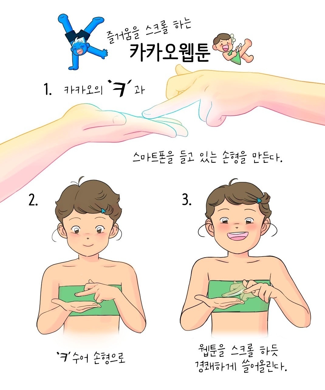 ‘카카오웹툰’은 한 손을 스마트폰처럼 펼치고 다른 손으로 ‘ㅋ’ 지문자를 스크롤하듯 쓸어 올려 표현하며, ‘카카오페이지’는 ‘k’ 지문자와 손바닥을 맞대 책을 표현한 뒤 이를 펼치는 모양이다. 공식 수어가 없는 경우 브랜드 자음과 모음을 손으로 일일이 표현해야 한다는 점에서 농인이 창작자로 참여한 이번 공식 수어명이 농인 사이의 의사소통은 물론 농문화 증진에 꾸준히 기여할 수 있다.