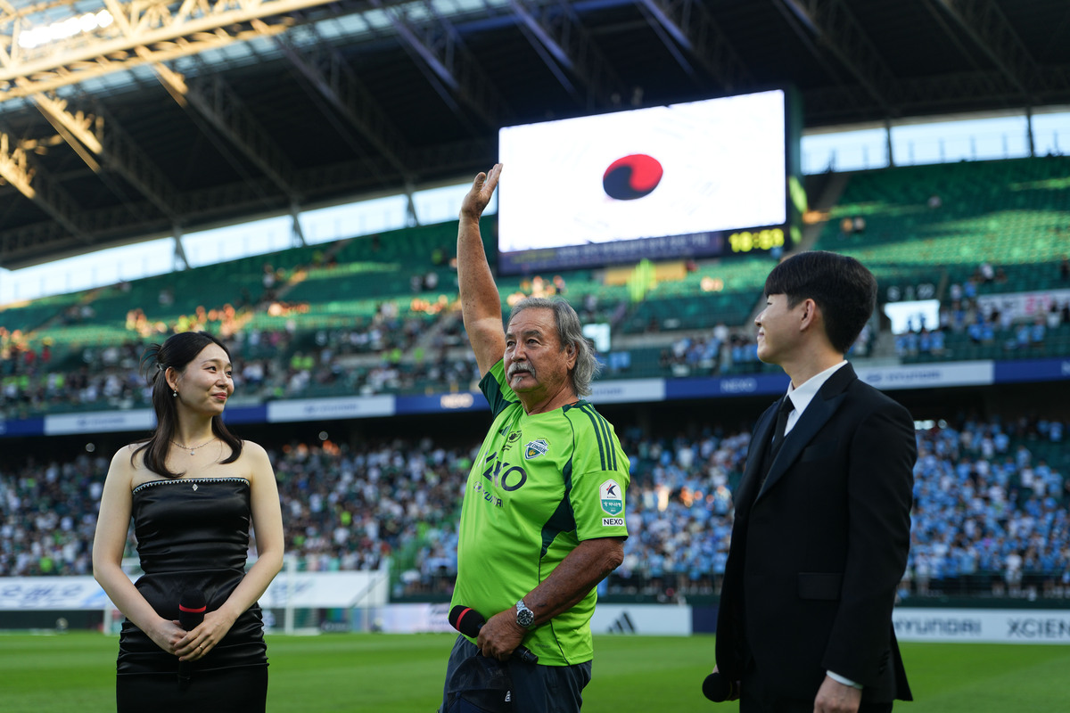 전북현대는 ‘필립 안 커디’씨의 시축과 함께 AI 기반의 영상 복원 기술을 활용해 전광판에 ‘도산 안창호’ 선생의 생전 모습을 되살렸다. 전주성에 나타나 팬들과 손자를 맞이하는 듯한 따뜻한 도산의 미소가 재현되자, 경기장 곳곳에서는 깊은 존경심이 담긴 함성과 박수가 이어졌다.