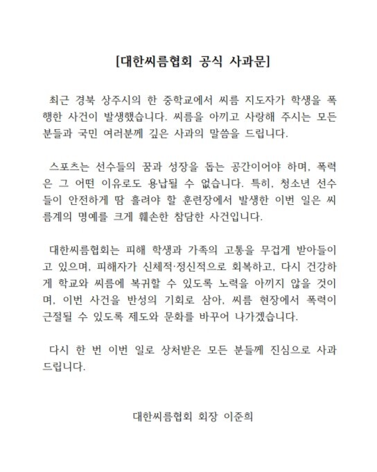 대한체육회는 강경한 자세다. “최근 경북 상주의 한 중학교 씨름부에서 발생한 ‘삽 폭행 사건’을 비롯, 태권도·피겨 종목 등에서 연이어 드러난 미성년자 대상 폭행과 장기간 가혹행위 사건에 대해 깊은 유감을 표하며, 이러한 사건이 재발하지 않도록 가장 강력한 수준의 징계 규정과 무관용 원칙을 전면 시행하겠다”는 설명이다.