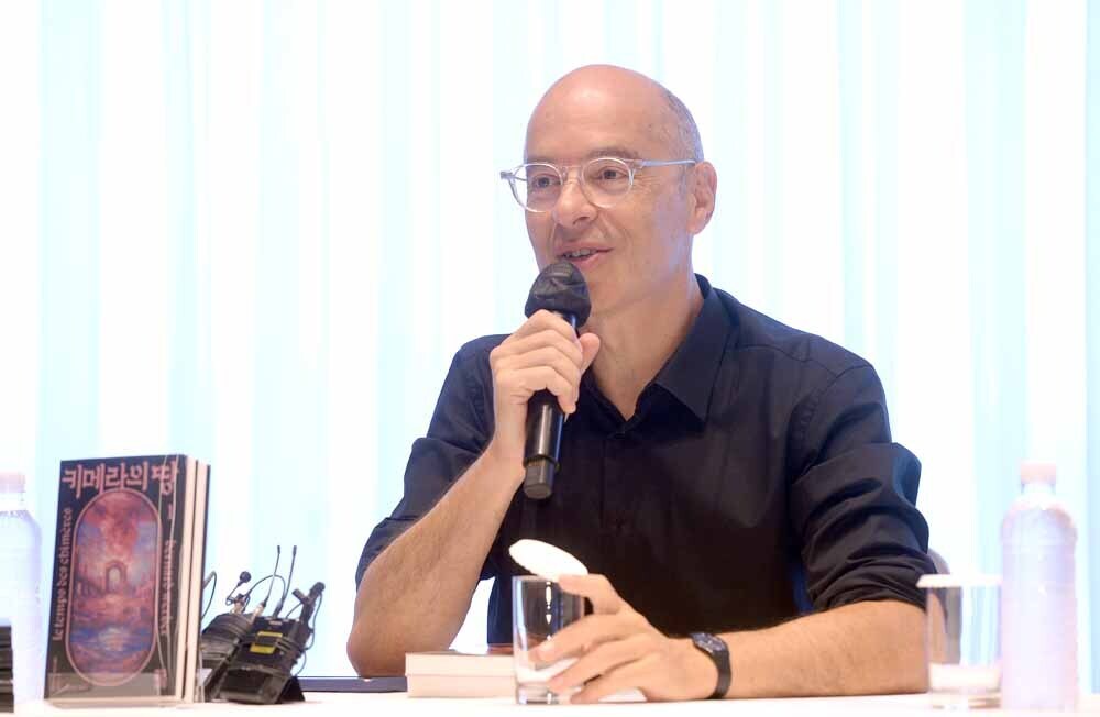 20일 서울 중구 앰배서더 서울 풀만 호텔에서는 베르나르 베르베르 방한 기념 기자 간담회가 열렸다. 이날 발간한 그의 신간 ‘키메라의 땅’은 인류가 스스로의 과오로 인해 자멸하다시피 한 지구 위에 유전자 실험의 결과물인 키메라들이 새로운 지배자가 되어 가는 과정을 그렸다.
