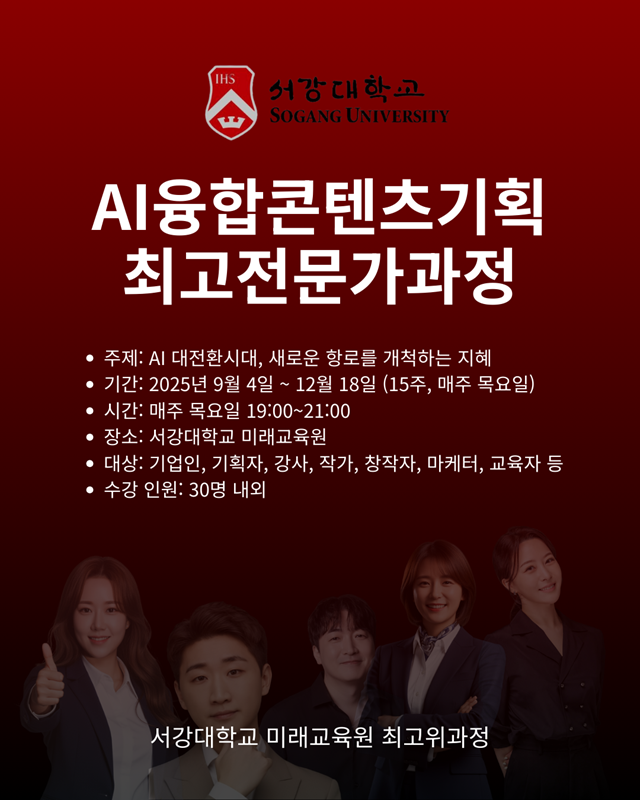 서강대 미래교육원은 ‘인공지능 대전환 시대, 새로운 항로를 개척하는 지혜’를 주제로 생성형 AI 활용 능력과 콘텐츠 기획 역량을 융합한 실전형 교육 프로그램인 ‘AI융합콘텐츠기획 최고전문가과정’을 신설한다. 단순한 AI 도구 습득을 넘어 수강생 스스로 ‘나만의 스토리’를 기획하고 제작하며 세상과 연결하는 콘텐츠 창작자로 성장하는 것이 이번 최고위과정의 취지다.